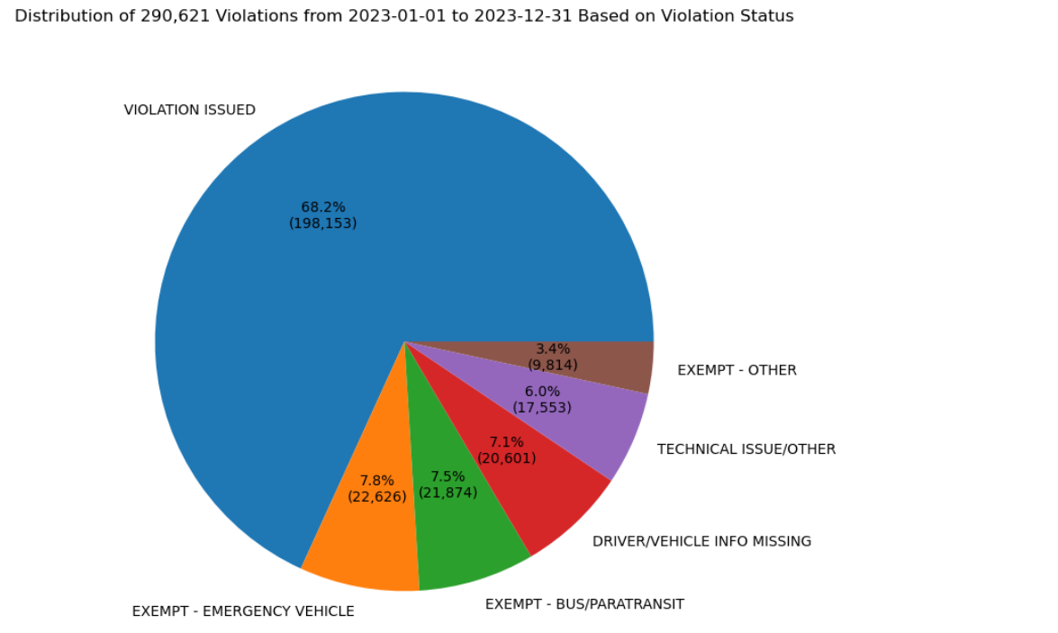 Violation Issued: Dropped 11%. This means a smaller number of violations are being flagged as acutal, enforced violations. A larger amount of violations are being processed into categories such as "Technical Issue/Other" and "Driver/Vehicle Info Missing" rather than more concrete and readable categories like "Exempt - Bus/Paratransit" and "Exempt - Emergency Vehicle".