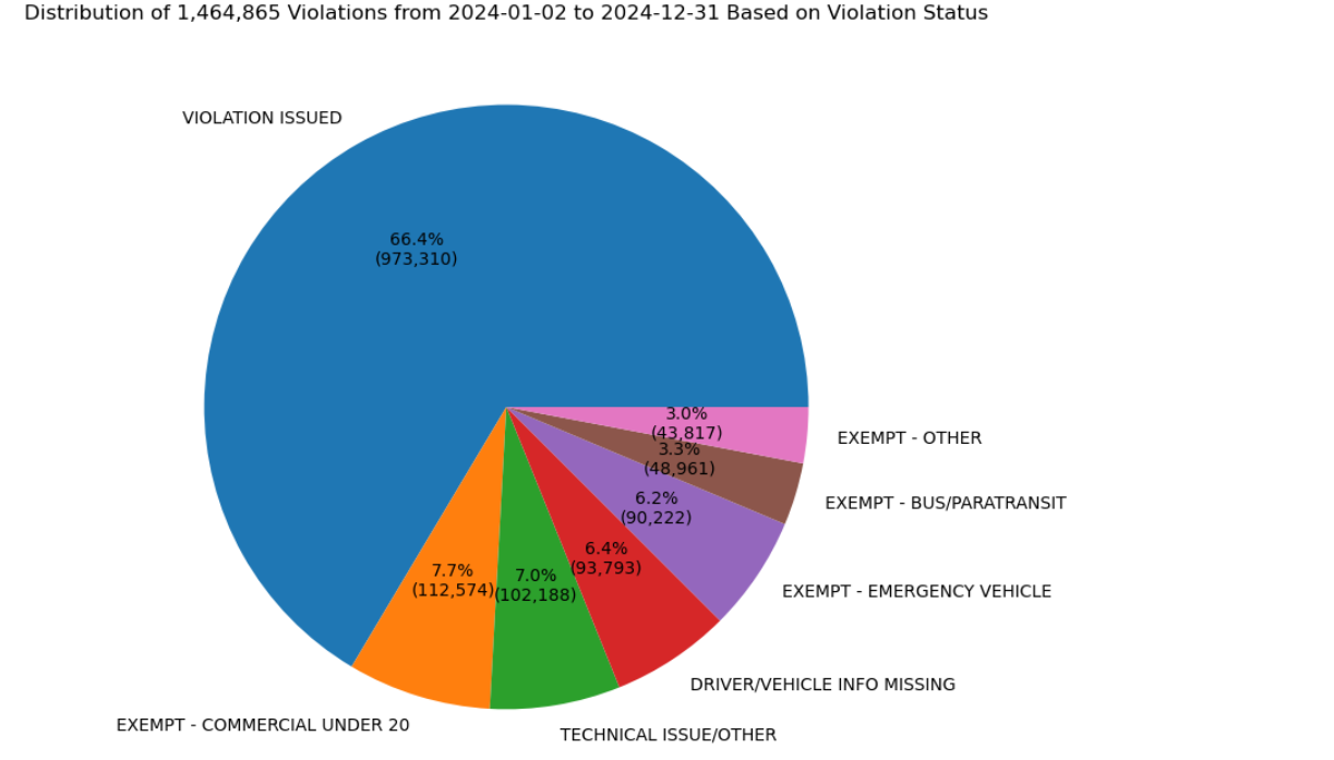 2024: 1,464,865 violations, 102,188 represented had missing information, having the MTA lose out on a minimum of $3,392,600 in uncollected fines. 25.5% exmept violations, with commercial under 20 and emergency vehicles being the top two most repeat offenders