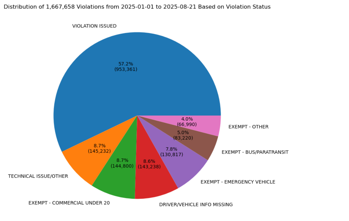 2025: out of 1,667,658 violations, 145,232+ represented had missing information, having the MTA lose out on a minimum of $4,153,635 in uncollected fines. 25.5% of all violations were exempt, with commercial under 20 and emergency vehicles being the top two most repeat offenders