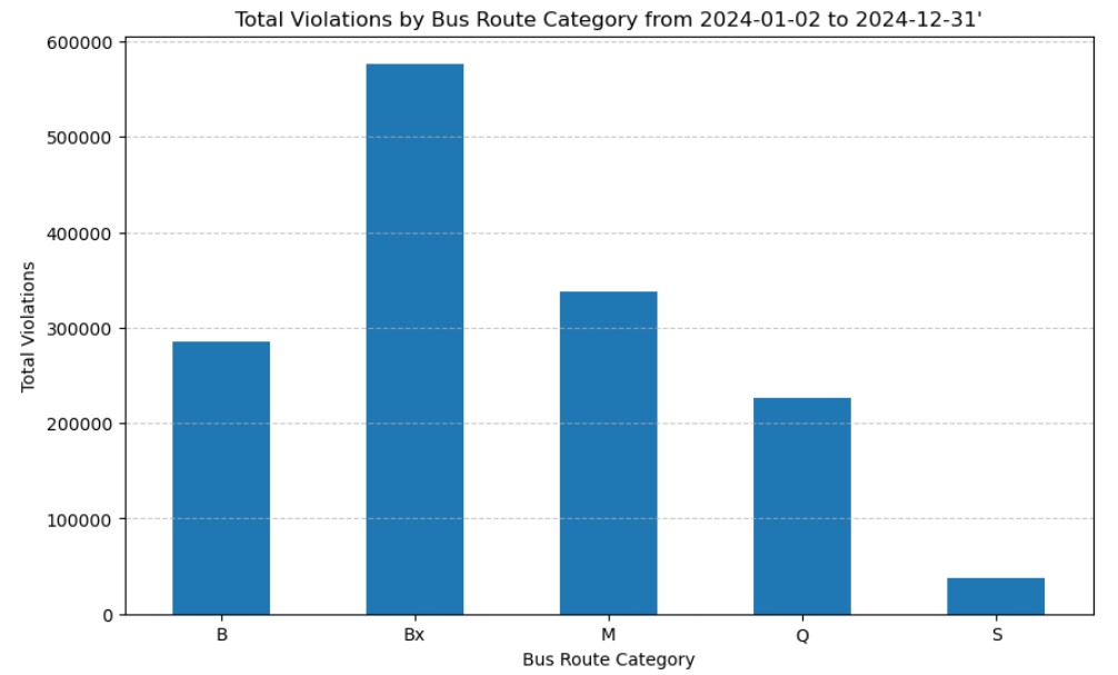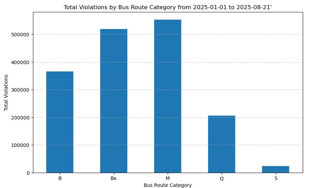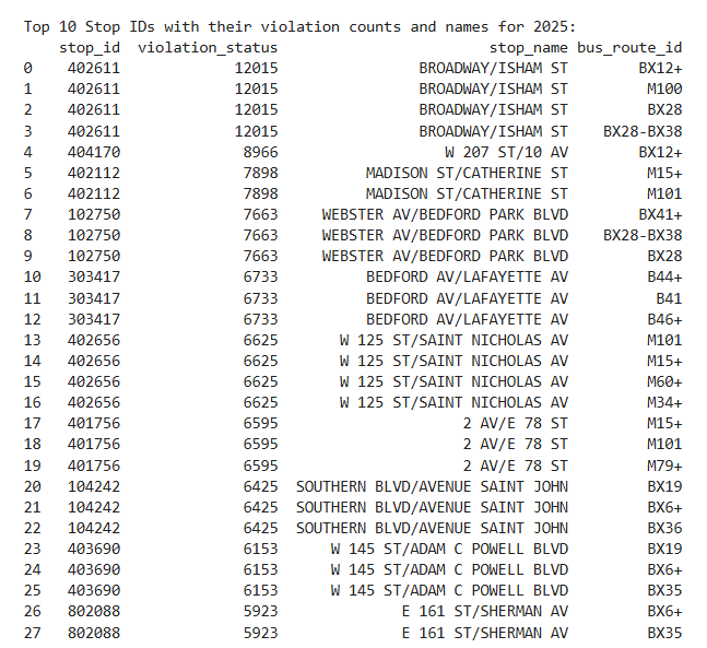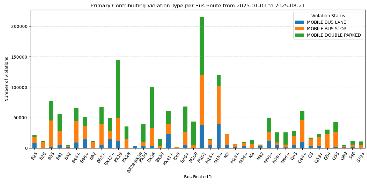 Double Parking: In 2025, 43.7% of violations consisted of double parking in bus lanes. This directly reflects a major issue as the amount of vehicles is vastly larger than the number of avaliable parking spots. Businesses may have insufficient loading zones and there is always competition and pressure on where to park.